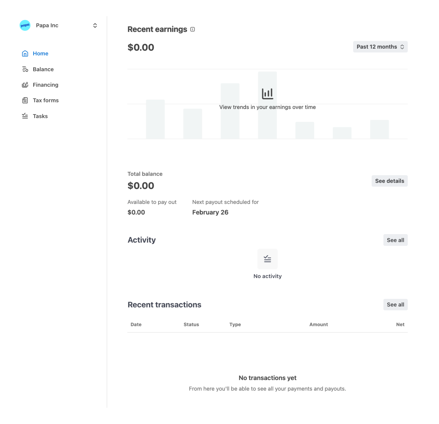 When you log in to your Stripe account, you will land on the Home Screen. This is where you will see your dashboard that shows your:
